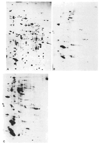 (A,C) or of 30 nuclei were subjected to two-dimensional gel analysis and fluorography as detailed in Materials and