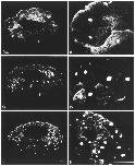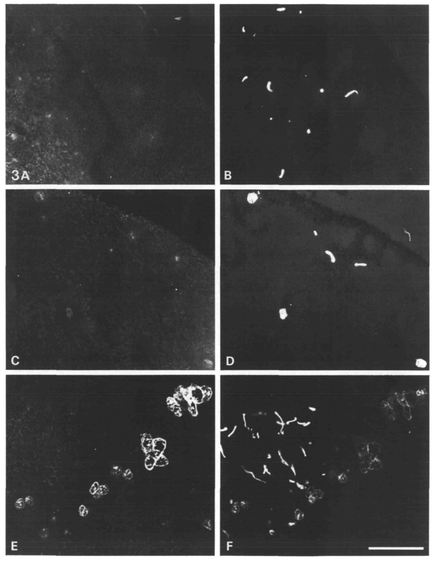 (E). Counterstaining of the same sections with DAPI is shown in the right panels (B,D,F). Bar 50m. |