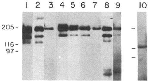 Molecular mass markers are at 205, 116, and 97 kD, respectively.