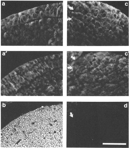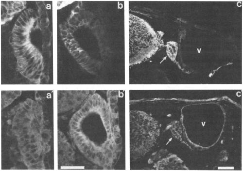 Figure 5. Formation of the otic vesicle. Staining pattern of polyelonal antibodies directed against N-CAM (a-c) and L-CAM (a'-c'). (a,