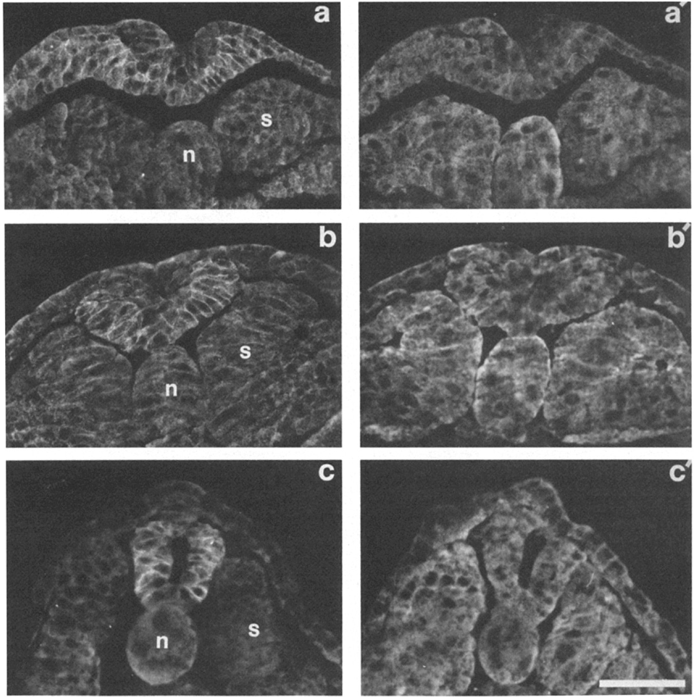 a') Stage 25; (b, b') stage 33; (c, c') stage 39. N-CAM expression strongly increases during condensation of the plaeodes; during later