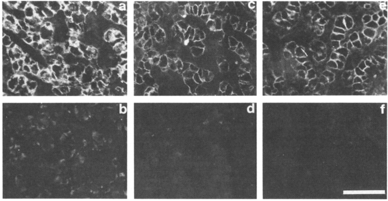 Figure 8. Adult Xenopus liver. (a) Polyclonal antibody anti-Xenopus N-CAM. (b) Polyclonal antibody anti-L-CAM. (c) Monoclonal antibody