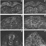 Figure 7. Adult Xenopus organs. Staining pattern of polyclonal antibodies directed against N-CAM (a-f) and L-CAM (a'-f'). Retina (a,