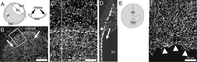 interface into the cleft of Brachet (arrowheads) but not at the mesoderm/