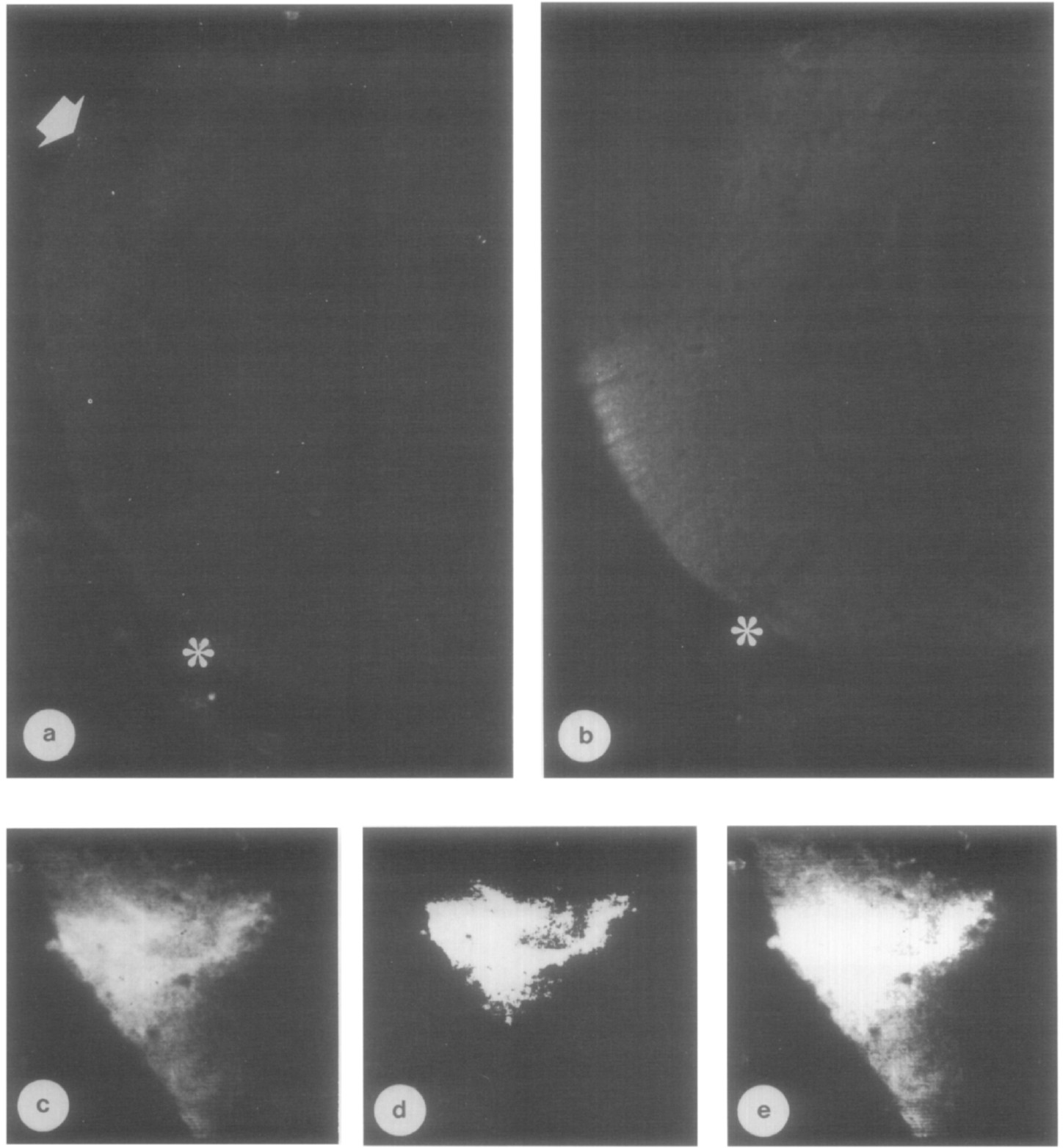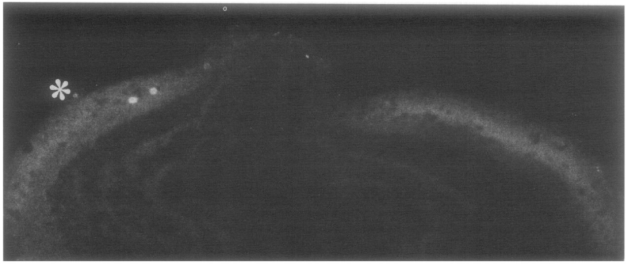 FIG. 6. Indirect immunofluorescence of MAb-A5 in the mesencephalic region in development. (a) A section of the rostra1 part of the optic