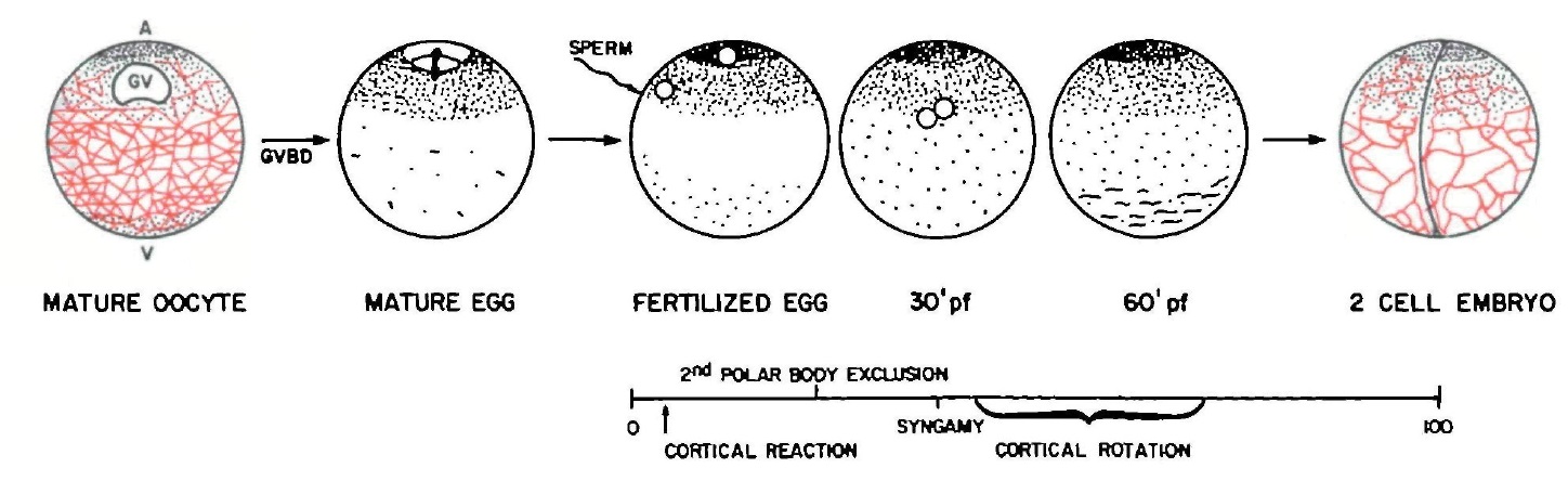 mature oocytes (left) through to the 2-cell embryo (right) is diagrammed here. Cytokeratin organization, as visualized