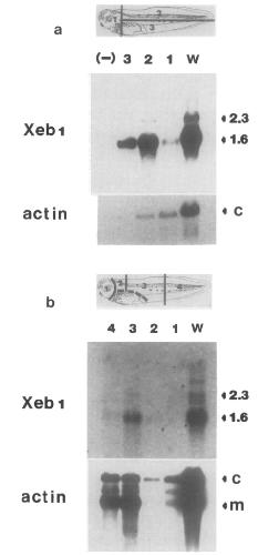FIG. 2. Northern blots of RNAs extracted from dissected embryos. Poly(A)* RNA from 200 dissections of stage 41 tadpoles was loaded in each gel (1.2% formaldehyde-agarose) lane and eventually was transferred to GeneScreen membranes (New England Nuclear). Hybridization was performed at high stringency with a “P-nick-translated 1.4-kb Xebl fragment (>107 cpm/pg). Transcript sizes, indicated in kilobases, were estimated with rRNA standards (Carrasco et ah, 1984). (a) Planes of dissection shown in embryo diagram. Lane w = whole embryo (10 pg RNA-equivalent to yield from approx 50 embryos); 1 = head (5 Fg); 2 = dorsal (5 fig); 3 = ventral (3 Kg); (-) = 20 pg poly(A)) RNA from whole embryos. The same filter was washed and rehybridized with a cytoplasmic actin probe. (b) Planes of dissection shown in embryo diagram. Lane w = whole embryo (8 wg RNA-from approx 50 embryos); 1 = anterior head region (6 pg); 2 = posterior head region (2.5 pg); 3 = trunk (5 fig); 4 = tail (5 fig). Also included is the rehybridization of the filter with a mixture of muscle specific (m) and cytoplasmic (c) actin cDNA probes. Two-week autoradiographic exposure.