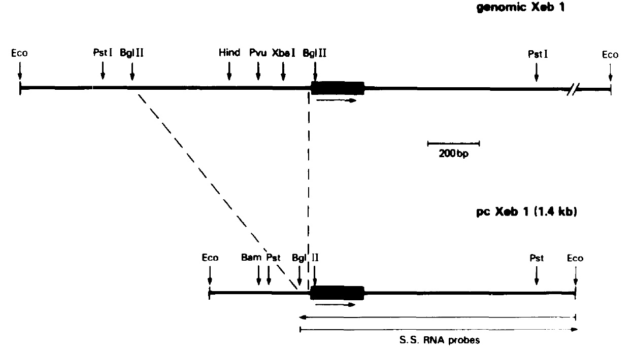 FIG. 1. Restriction map of the genomic recombinant clone and the pcXeb 1 cDNA clone. The Xebl cDNA was isolated from a gtl0 phage library of stage 12 Xenopus laevis embryos. The black box indicates the region homologous to the Drosophila homoeo-box (Carrasco et al., 1984). The direction of transcription is from left to right (arrow). The arrows in both directions in the lower diagram indicate the 900~bp BgiII-EcoRI fragment which was used to produce single-stranded RNA probes.