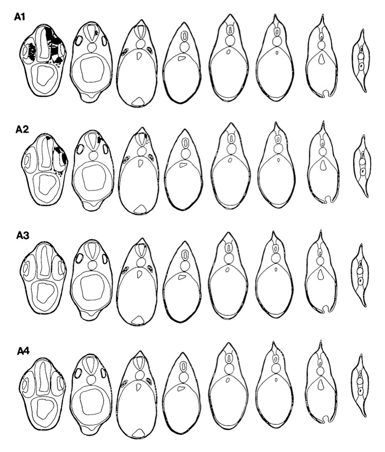 Figure 5. 3D reconstructions of typical cases representing each of the 16 blastomere injections. [A blastomeres]