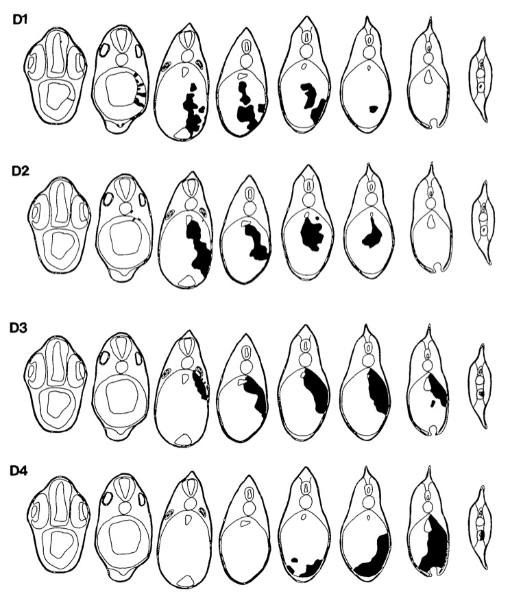 Figure 5. 3D reconstructions of typical cases representing each of the 16 blastomere injections. [D blastomeres]