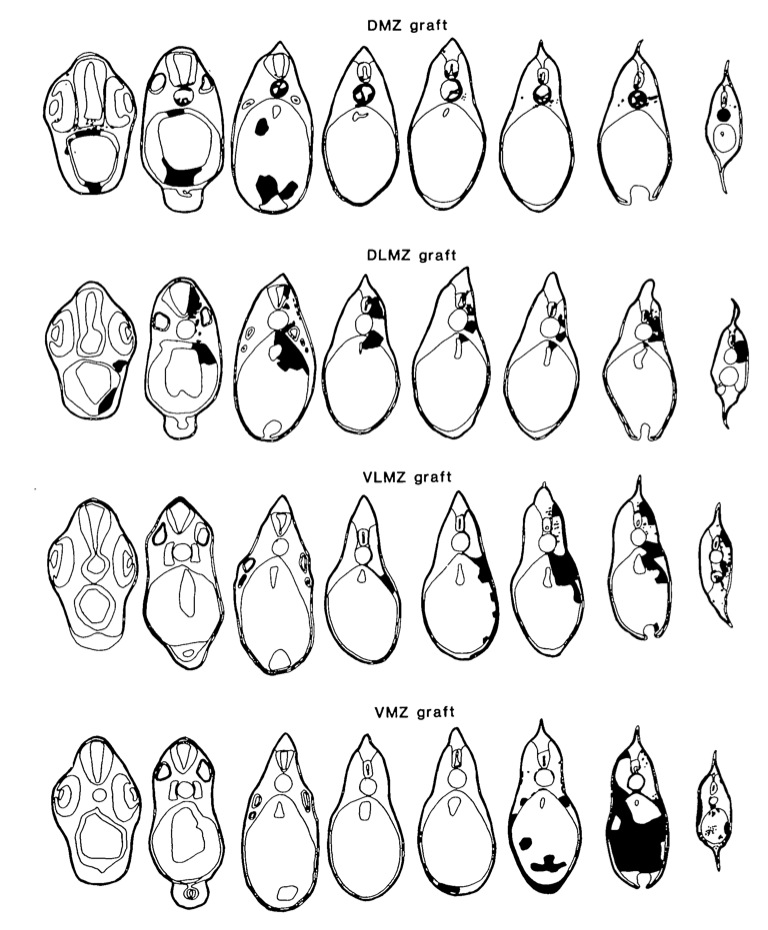 Fig. 1. (A) Nomenclature of blastomeres at the 32-cell stage. D, dorsal; V, ventral; AP, animal pole; VP, vegetal pole. (B) Orthotopic grafts at stage 10 viewed from vegetal pole. (C) Orthotopic grafts viewed in median section. AP, animal pole; VP, vegetal pole; DMZ, dorsal marginal zone; DLMZ, dorsolateral marginal zone; VLMZ, ventrolateral marginal zone; VMZ, ventral marginal zone.