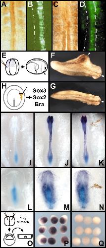 Fig. 1. Smad6 does not induce neural markers in the chick. (A-G) Experiments to test the activity of Smad6. Smad6-IRES-GFP was electroporated into one half of the chick neural tube (A,B). Staining against phospho-Smad1 (A) reveals that activation of Smad1 has been inhibited in the electroporated cells (green in B), while in control GFP electroporated embryos (C,D) phospho-Smad1 is not altered (C). cSmad6 injection into the marginal zone in Xenopus (E) induces a secondary axis (F), while GFP-injected controls appear normal (G). (H-N) Smad6 does not induce neural markers. Electroporation of Smad6 into competent area opaca epiblast at stage 3+ (H) does not induce Brachyury (I,L; light blue), Sox2 (J) or Sox3 (M) (purple). In this and subsequent figures, electroporated cells were visualized by staining with anti-GFP antibody (K, N; brown). (O-Q) Positive controls. cSmad6 or GFP was injected at the two-cell stage and animal caps isolated at early gastrula (O). Smad6 (P) can neuralize animal caps, while GFP cannot (Q), as assessed by Sox3 expression.