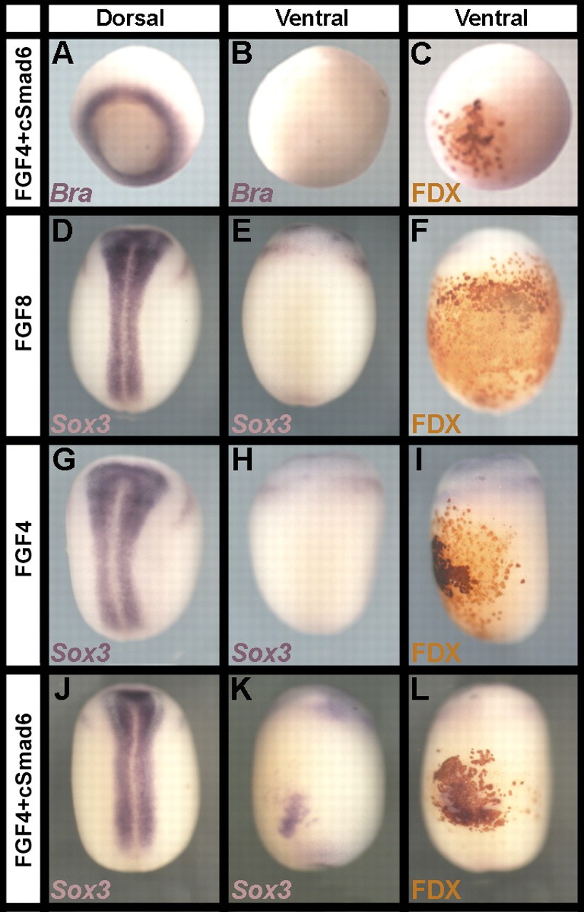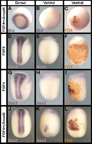 Fig. 7. Effects of BMP inhibition in combination with FGF in Xenopus. Embryos were injected into the A4 blastomere at the 32-cell stage. FGF4 in combination with cSmad6 does not induce brachyury in prospective ventralectoderm cells at stage 10+ (A-C). Neither FGF8 nor FGF4 is able to induce Sox3 in the ventralepidermis cells of early neurula stage embryos (D-I), while misexpression of FGF4 together with Smad6 induces a patch of Sox3 (J-L). (A,D,G,J) Dorsal views; (B,E,H,K) ventral views of same embryos, which are shown again in C,F,I,L after anti-fluorescein staining.