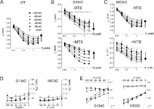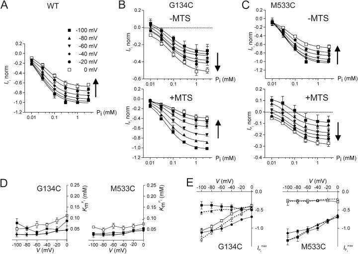Figure 1. . Voltage dependency of Pi activation in 100 mM Na+. (A) Pi activation characteristics for WT-expressing oocytes determined at six membrane potentials from −100 mV to 0 mV as indicated by different symbols. Each data point is the difference between current recorded in ND100 + Pi and ND100 shown as mean ± SEM (n = 3). Currents were normalized to the magnitude of IPi at 1 mM Pi, V = −100 mV for each cell. Currents for these cells ranged from −76 to −88 nA at 1 mM, V = −100 mV. Arrow indicates direction of depolarization. Continuous lines are fits to the data points using Eq. 1. (B) Pi activation characteristics for G134C-expressing oocytes (n = 4) determined at six membrane potentials as in A, before (top) and after (bottom) incubation in 1 mM MTSEA for 3–5 min. Note the different ordinate scales for the −MTS and +MTS cases. Currents were normalized to the magnitude of IPi for G134C + MTS at 1 mM Pi, V = −100 mV. Currents for these cells ranged from −22 to −69 nA at 1 mM, V = −100 mV. (C) Pi activation characteristics for M533C-expressing oocytes (n = 4) determined at six membrane potentials as in A before (top) and after (bottom) incubation in 1 mM MTSEA for 3–5 min. Note the different ordinate scales for the −MTS and +MTS cases. Currents were normalized to the magnitude of IPi for M533C − MTS at 1 mM Pi, V = −100 mV. Currents for these cells ranged from −61 to −123 nA at 1 mM, V = −100 mV. (D) Voltage dependency of apparent Pi affinity (KmPi) for G134C (left) and M533C (right). Data points indicate mean ± SEM of KmPi reported from fits to Pi activation data for the individual oocytes pooled in A–C. WT, filled circles; mutant − MTS, filled squares; mutant + MTS, empty squares. (E) Voltage dependency of predicted maximum Pi-dependent current (ImaxPi) for G134C (left) and M533C (right) with WT data superimposed. ImaxPi is shown as mean ± SEM predicted from fits to data for the individual oocytes pooled in A–C, with WT data superimposed. WT, filled circles; mutant − MTS, filled squares; mutant + MTS, empty squares. Maximum cotransport activity determined using the leak correction procedure (see text) is also shown. Mutant − MTS, filled triangles; mutant + MTS, empty triangles, with points joined by dashed lines. |