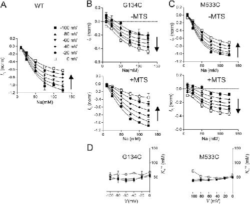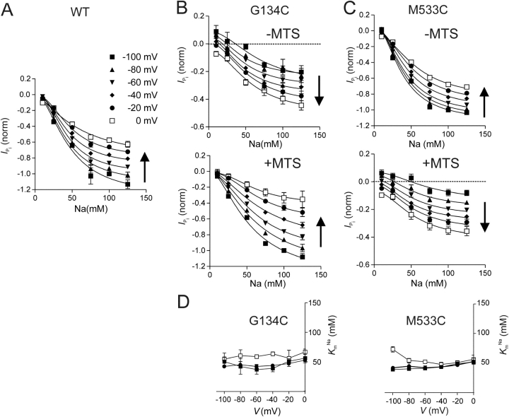 Figure 2. . Voltage dependency of Na+ activation in 1 mM Pi. (A) Na+ activation characteristics for WT-expressing oocytes determined at six membrane potentials from −100 to 0 mV as indicated by different symbols. Each data point is the difference between current recorded in NDX + Pi and NDX, shown as mean ± SEM (n = 4), where X is the respective Na+ concentration (in mM) and Pi = 1 mM. Currents were normalized to the magnitude of IPi at 1 mM Pi, V = −100 mV, and ND100. Arrow indicates direction of depolarization. Continuous lines are fits to the data points using Eq. 2 with nH as a free parameter. (B) Normalized Na+ activation data for G134C-expressing oocytes determined at six membrane potentials as in A before (top) and after (bottom) incubation in 1 mM MTSEA for 3–5 min. Continuous lines are fits to the data points using Eq. 2 with nH as a free parameter for G134C + MTS, and nH = 2 for G134C − MTS. Note the different ordinate scales for the −MTS and +MTS cases. Currents were normalized to the magnitude of IPi for G134C + MTS, ND100, V = −100 mV. (C) Normalized Na+ activation data for M533C-expressing oocytes (n = 4) determined at six membrane potentials as in A before (top) and after (bottom) incubation in 1 mM MTSEA for 3–5 min. Continuous lines are fits to the data points using Eq. 2 with nH as a free parameter for M533C − MTS, and nH = 2 for M533C + MTS. Note the different ordinate scales for the −MTS and +MTS cases. Currents were normalized to the magnitude of IPi for M533C − MTS, ND100, V = −100 mV. (D) Voltage dependency of apparent Na+ affinity (KmNa) for G134C (left) and M533C (right). Data points indicate mean ± SEM of KmPi reported from fits to Na+ activation data for the individual oocytes pooled in A–C. WT, filled circles; mutant − MTS, filled squares; mutant + MTS, empty squares. |