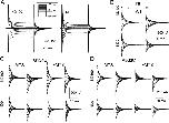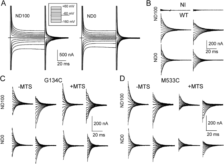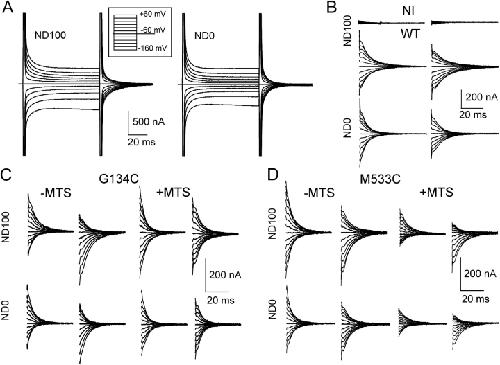 Figure 4. . Effect of MTS exposure on presteady-state relaxations of mutants. (A) Representative presteady-state relaxations recorded from an oocyte expressing the WT NaPi-IIa protein superfused in 100 mM Na+ (ND100) and 0 mM Na+ (ND0) for the voltage step protocol shown in the inset. (B) Main component of presteady-state relaxation for a noninjected oocyte (NI) and the same WT-expressing cell in A, resolved by applying a two-exponential fitting procedure (see materials and methods). The ON (step from −60 mV to test potential) and OFF (step from test potential to −60 mV) relaxations are shown for superfusion in ND100 (top and middle traces) and ND0 (bottom traces). (C) Main ON and OFF relaxations for a representative G134C-expressing oocyte before (−MTS) and after (+MTS) exposure to 1 mM MTSEA (1 mM) for 3 min, superfused in ND100 and ND0. (D) Main ON and OFF relaxations for a representative M533C-expressing oocyte before (−MTS) and after (+MTS) exposure to 1 mM MTSEA (1 mM) for 3 min, superfused in ND100 and ND0. |