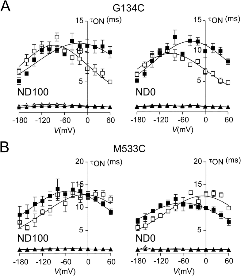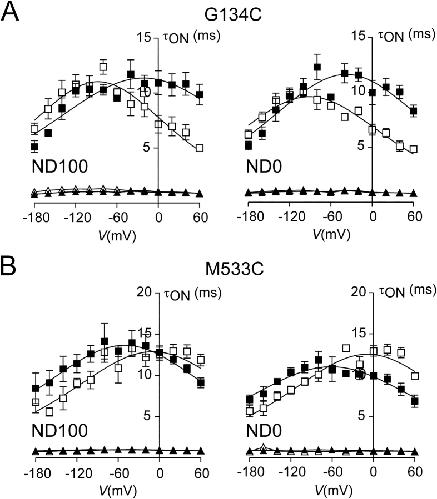 Figure 5. . Analysis of presteady-state relaxations; ON time constants (τON) for mutant G134C (A) and M533C (B). Voltage dependencies of time constants (τON) were obtained by fitting presteady-state relaxations in response to voltage steps from −60 mV to the indicated voltage with a double exponential (see materials and methods). Each point represents mean ± SEM of four cells. Fast τON (triangles), slow τON (squares); before MTSEA (filled symbols); after MTSEA (empty symbols) incubation (1 mM, 3 min). Continuous lines were obtained by fitting Eq. 4 to the data (Table I). Data for two superfusion conditions: ND100 (left) and ND0 (right). Data points at the holding potential (−60 mV) were determined from fits to the OFF relaxations. |