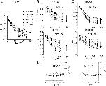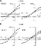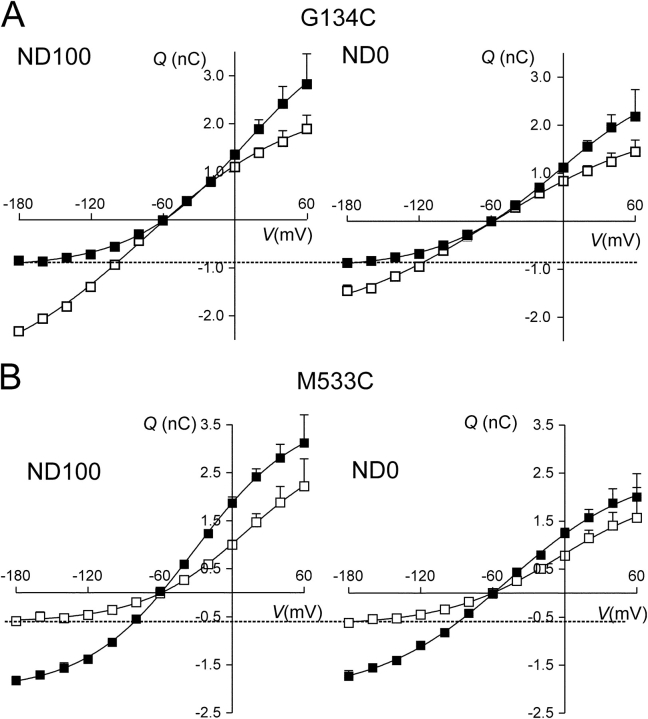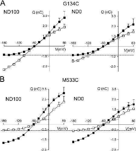 Figure 6. . Analysis of presteady-state relaxations: charge–voltage (Q–V) data for a representative oocyte expressing G134C (A) and M533C (B). Each point is given by (QON–QOFF)/2, where QON and QOFF are the charges moved for the ON and OFF voltage steps from and to −60 mV, respectively. Errors smaller than symbol size are not shown. Left, superfusion in ND100; right, superfusion in ND0 for the same oocyte. Filled symbols, before MTSEA exposure; empty symbols, after MTSEA exposure. Dashed lines have been drawn to indicate the apparent equality of charge movement at hyperpolarizing potentials for ND100 and ND0 superfusion for G134C − MTS and M533C + MTS. Continuous lines were obtained by fitting Eq. 3 to the data. For G134C, the fit parameters were as follows: in ND100 (±MTS), Qmax = 5.1/5.9 nC, Qhyp = −0.9/−3.4 nC; V0.5 = −7/−77 mV; z = 0.5/0.4; and in ND0 (±MTS), Qmax = 4.0/4.3 nC, Qhyp = −1.0/−2.1 nC; V0.5 = −5/−59 mV; z = 0.5/0.4. For M533C, the fit parameters were as follows: in ND100 (±MTS), Qmax = 5.8/3.7 nC, Qhyp = −2.0/−0.7 nC; V0.5 = −32/+11 mV; z = 0.6/0.6; and in ND0 (±MTS), Qmax = 4.8/2.9 nC, Qhyp = −2.1/−0.6 nC; V0.5 = −48/−5 mV; z = 0.5/0.5. |