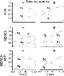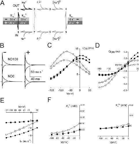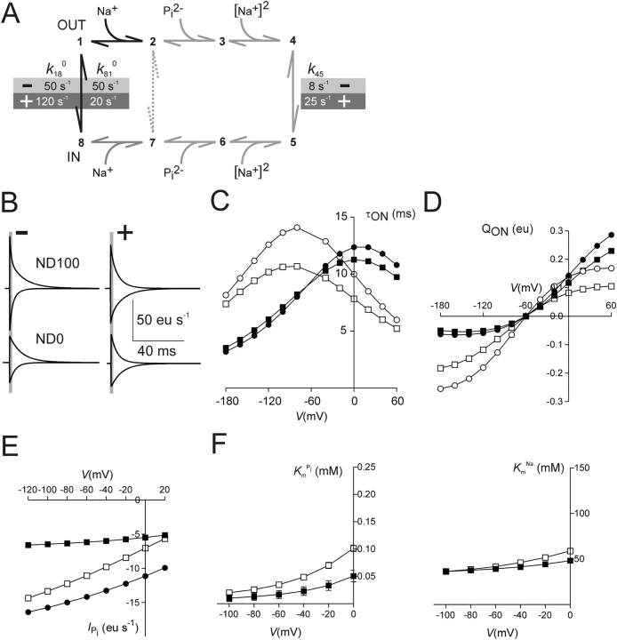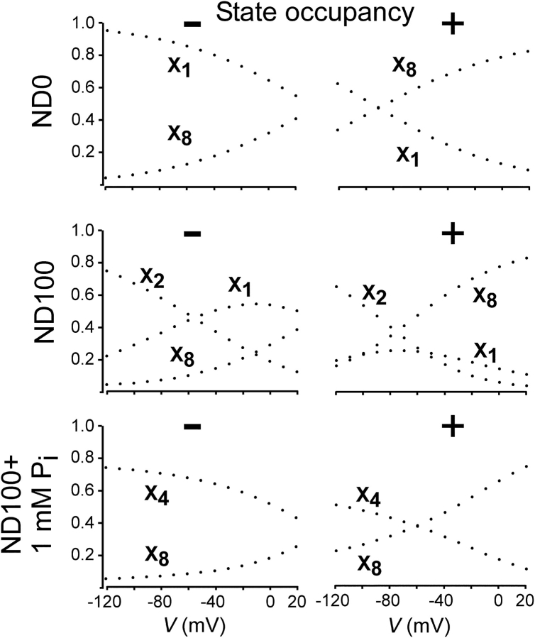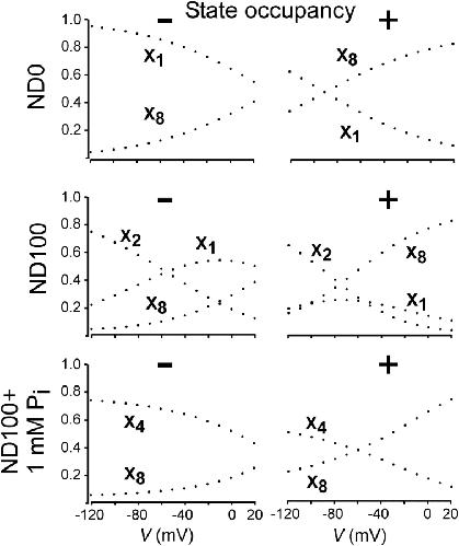 Figure 8. . Simulations of occupancy of states 1, 2, 4, and 8 of the model scheme depicted in Fig. 7 A, as a function of membrane potential in zero external Na+ (ND0), 100 mM external Na+ (ND100), and 100 mM external Na+ with 1 mM Pi (ND100 + 1 mM Pi), before (−) and after (+) modification of Cys-134. |