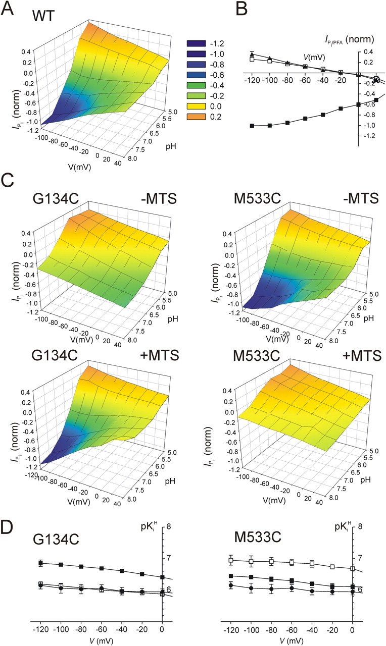 Figure 3. . Effect of MTS exposure on pH and voltage dependency. (A) Steady-state pH–V profile of WT showing IPi (1 mM total Pi) as a function of external pH and V. Currents were normalized to the magnitude of IPi at −100 mV, pH 7.4, and pooled (n = 4). Error bars omitted for clarity. Legend indicates color and corresponding IPi (norm). (B) Normalized, pooled (n = 5) I–V data for WT that compares IPi at pH 5.0 (open squares) with PFA-dependent current at pH 7.4 (filled triangles), normalized to the magnitude of IPi at −100 mV, pH 7.4 (filled squares). (C) Steady-state pH–V profiles of mutant G134C (left) and mutant M533C (right) showing IPi (1 mM total Pi) as a function of external pH and V before (−MTS) and after (+MTS) exposure to 1 mM MTSEA. Currents were normalized to the magnitude of IPi at −100 mV, pH 7.4, for G134C + MTS and M533C − MTS. Each data point is the mean of four cells from the same donor frog. Error bars omitted for clarity. The assay was repeated after exposure for 5 min to 1 mM MTSEA. Colored contour planes are as in A. (D) Voltage dependency of apparent inhibition constant for protons, KiH, (expressed in pH units) for G134C (left) and M533C (right) before (filled) and after (open) exposure to MTSEA. pKiH for WT is shown superimposed in both cases (filled circles). Data points were fitted with the modified Hill equation (Eq. 2) with nH as a free parameter and external proton concentration expressed logarithmically. Error bars indicate SEM of fit estimate for pKiH. |