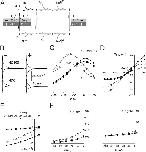 Figure 7. . Modeling voltage-dependent presteady-state and steady-state kinetics for G134C − MTS and G134C + MTS. (A) Eight-state kinetic scheme for NaPi-IIa. Voltage-dependent transitions are shown bold. All other transitions are electroneutral. Critical transitions for simulating G134C − MTS (−) and G134C + MTS (+) are 1–8, 8–1, and 4–5. The corresponding voltage-independent rates used in the simulations are indicated. Dashed transition indicates a proposed leak pathway. (B) Simulations of presteady-state relaxations before (−) and after (+) MTS modification of Cys-134 using the model scheme of A for steps to potentials in the range −180 to +80 mV from Vh = −60 mV and two superfusion conditions. The vertical gray bars indicate the initial 2.5-ms interval after which presteady-state currents were resolved experimentally. Differential equations describing the transitions were solved for the state occupancies as a function of time. The presteady-state current per cotransporter molecule can be expressed as −e(α′(k12X1 − k21X2) − δ* (k18X1 − k81X8) + α′′(k78X7 − k87X8)) (e.g., Parent et al., 1992), where Xn is the occupancy of state n and kij is the transition rate from state i to state j. The empty carrier (1–8) carries an equivalent charge of −1 that moves an equivalent electrical distance δ through the membrane. The Na+ binding transitions (1–2 and 8–7) also involve movement of +1 charge through equivalent electrical distances α′ and α′′, respectively. To simplify the simulations, α′′ = 0.3, α′ = 0.3, and δ = 0.4 and the corresponding energy barriers were symmetrical. The rate constants for voltage-dependent transitions are given by k18 = k18o exp(δeV/2kT), k81 = k81o exp(−δeV/2kT), k12 = Na k12o exp(−α′eV/2kT), k21 = k21o exp(α′eV/2kT), where kijo is the rate constant for transition ij at V = 0, and Na is the concentration of Na+ (mM). Other fixed rate constants for the simulations were k12o = 2000 s−1M−1, k21o = 600 s−1, k23 = 7.5 × 106 s−1M−1, k32 = 1000 s−1, k34 = 106 s−1M−2, k43 = 1000 s−1, k54 = 25 s−1, k78 = 100, k87 = 106 s−1M−1, k67 = 1000 s−1, k76 = 106 M−1s−1, k65 = 105 s−1M−2, k56 = 1000, k23= 0.005 s−1. To satisfy microscopic reversibility, k32 and k76 were defined in terms of the other rate constants. (C) Predicted τ–V data was obtained by applying a single exponential fit to the ON presteady-state currents for voltages in the range −180 to +60 mV, commencing 2.5 ms after the step onset. Filled symbols, −MTS; open symbols, +MTS; circles, ND100; squares, ND0. Model parameters are as given in A and B above for the −MTS and +MTS conditions with Pi = 0. (D) Predicted Q–V data obtained by numerical integration of the presteady-state currents, commencing 2.5 ms after the step onset. Filled symbols, −MTS; open symbols, +MTS; circles, ND100; squares, ND0. Model parameters are as given in A and B above for the −MTS and +MTS conditions with Pi = 0. (E) Predicted steady-state I–V data for the −MTS (filled squares) and +MTS (open squares) conditions, using rate constants given in A and assuming Pi = 1 mM and external Na+ = 100 mM. The steady-state current is proportional to k14X1 − k41X4, i.e., the net flux for the only transition that involves transmembrane charge movement. Filled circles represent the simulated I–V data without changing k45 (see text). (F) Apparent substrate affinities for Pi activation (KmPi) (left) and Na+ activation (KmNa) (right) as a function of membrane potential. KmPi was obtained from a fit using the Michaelis-Menten equation (Eq. 1) to the steady-state activation data simulated with Pi in the range 0–3 mM and Na+ = 100 mM. KmNa was obtained from a fit using the modified Hill equation (Eq. 2) with Na+ in the range 0–125 mM and Pi = 1 mM. Filled symbols, −MTS; open symbols, +MTS. Error bars indicate ±SEM reported by fitting algorithm. |