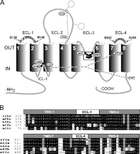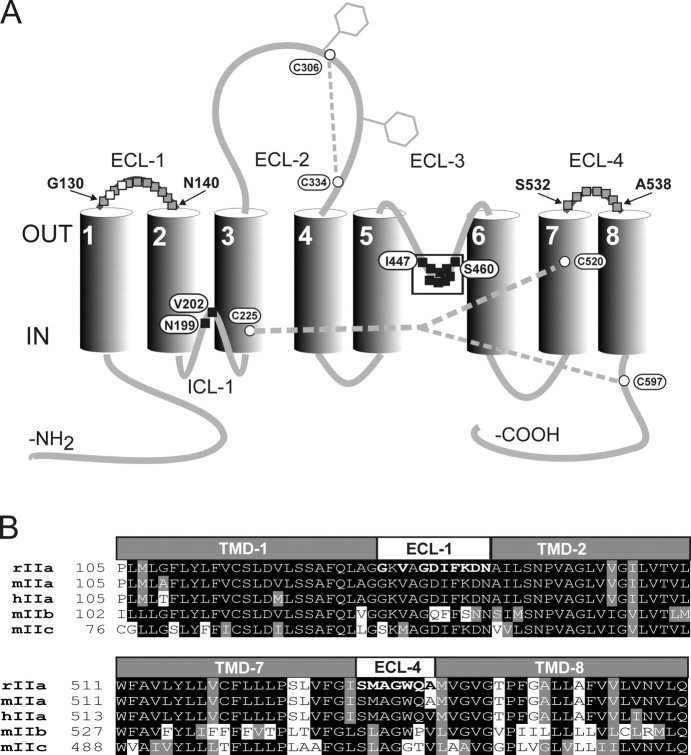 Figure 1. . (A) Topological representation of the rat type IIa Na+/Pi cotransporter comprises a backbone of eight putative membrane-spanning domains (TMD-1 to -8) and corresponding linker regions. A functionally essential cysteine bridge is formed between Cys-306 and Cys-334 in the large second extracellular linker (ECL-2) and an additional bridge between Cys-225 and either Cys-520 or Cys-597 has also been recently proposed (Kohler et al., 2003). The cluster of functionally important (MTS-accessible) sites previously identified by SCAM in the third extracellular linker (ECL-3) (Lambert et al., 2001) and two sites in the first intracellular linker (ICL-1) (Kohler et al., 2002a) are indicated (filled squares). Sites 130–140 in the putative first extracellular linker (ECL-1) and 532–538 in the predicted fourth extracellular linker (ECL-4) were mutated to cysteines in this study (gray-filled squares) (B) Comparison of the amino acid sequences for the predicted transmembrane domains flanking ECL-1 (TMD-1 and -2) and ECL-4 (TMD-7 and -8) show a high degree of homology between different isoforms of the type II Na+/Pi cotransporter family (SLC34). Bold lettered amino acids in ECL-1 and ECL-4 for the rat isoform were mutated to cysteines for the present study. Amino acids are named using the single letter code. |