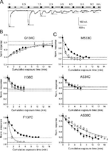 Figure 4. . Determination of MTS-Cys reaction rates for mutants that showed a change of activity after MTS exposure. (A) Representative recording of current from an oocyte that expressed mutant F137C after successive applications of MTSET (10 μM) (light gray bars). The cumulative exposure time (min) is indicated above each test response. Test substrates Pi (1 mM, black bars) and PFA (1 mM, dark gray bars) were applied for ∼20 s. (B and C) Pi-dependent currents at Vh = −50 mV, normalized to the initial value plotted as a function of cumulative MTS reagent exposure time for selected mutants in ECL-1 (B) and ECL-4 (C). Cells were exposed to either MTSEA (filled squares) or MTSET (open squares) for the cumulative time indicated and at the concentrations given in Table I. Continuous line is a fitted single exponential function with plateau (Eq. 1) from which the reaction rate and plateau were estimated. Each data point is pooled from ≥3 cells. Broken lines indicate plateau levels (IPi∞) estimated from the fit of Eq. 1 (Table I). |