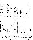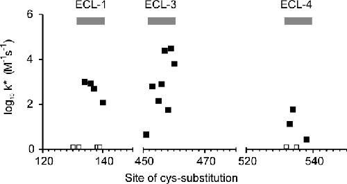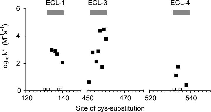 Figure 8. . Graphical representation of accessibility of three putative extracellular linkers based on effective second order reaction rate k* plotted on a logarithmic scale (filled squares). A larger k* indicates that the site has a greater accessibility from the external aqueous medium. Sites that were labeled with MTSEA-Biotin, for which the respective mutants showed no detectable change in activity, are indicated (empty squares). Data for ECL-1 and ECL-4 were obtained from this study (Table I); data for ECL-3 were replotted from a previous study (Lambert et al., 2001). |