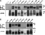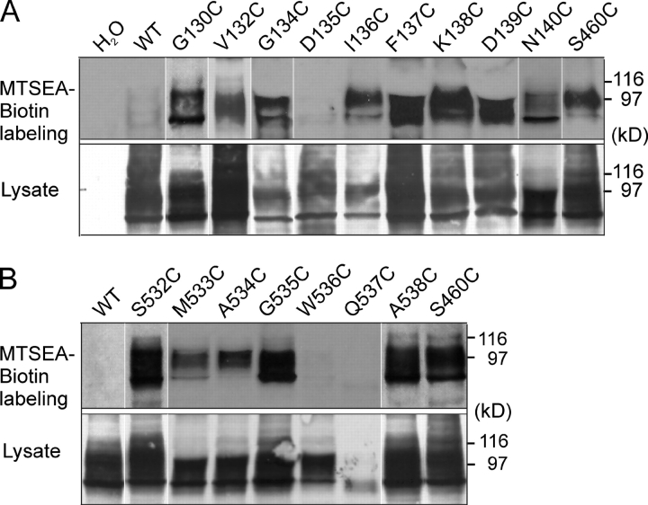 Figure 3. . Accessibility of cysteine mutants in ECL-1 (A) and ECL-4 (B) by MTSEA-Biotin. Western blots show streptavidin precipitates of MTSEA-biotinylated oocytes (top) and the corresponding whole cell lysates (bottom) from oocytes that expressed the indicated mutants probed with an antibody raised against the NH2 terminus of NaPi-IIa. Biotinylation data have been combined from several assays made from different batches of oocytes. In each assay, WT and water (H2O) injected oocytes were used as negative controls, and oocytes injected with cRNA coding for the mutant S460C (Lambert et al., 1999a) were used as a positive control. The band in the range 80–100 kD confirms that the labeled protein is NaPi-IIa. White lines indicate that intervening lanes have been spliced out. |