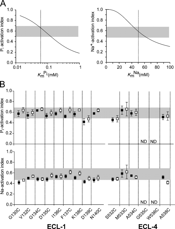 Figure 5. . Screening for deviations from WT behavior of substrate activation kinetics at −50 mV using a two-point assay. (A) Two-point assay sensitivity for Pi activation (left) and Na+ activation (right). Continuous lines are the Pi activation index (ratio of response in 100 mM Na+ to 0.1 mM Pi and 1 mM Pi) as a function of apparent affinity for Pi (KmPi) and Na+ activation index (ratio of response to 1 mM Pi in 50 mM Na+ and 100 mM Na+) as a function of apparent affinity for Na+ (KmNa), respectively. Indices were determined as a function of KmPi or KmNa using the modified Hill equation to describe the electrogenic response to Pi, IPi = IPimax (SnH)/(SnH + KmSnH), where S is the concentration of the variable substrate, KmS is the apparent affinity constant, nH is the Hill coefficient (nH = 1.0 for Pi activation, nH = 2.5 for Na+-activation; Forster et al., 1998, 1999), and IPimax is the Pi-dependent change in holding current at the saturating limit. In general, KmS and IPimax can also depend on the concentration of the invariant substrate and holding potential (Vh). Lower test concentration was chosen close to previously reported estimates for the WT apparent affinity, and upper test concentration was chosen close to the saturation concentration for Pi or maximum usable Na+ concentration, for the Pi and Na+ activation screens, respectively. For each case, the gray bar represents range of index values observed for WT-expressing oocytes (n = 9, three donor frogs). Vertical lines indicate typical KmPi for WT (0.06 mM) and KmNa for WT (50 mM) at −50 mV, previously reported (e.g., Forster et al., 1998), respectively. (B) Pi activation index (top) and Na+ activation index (bottom), where each point is mean ± SEM for ≥4 oocytes. Gray bars indicate typical range observed for WT-expressing oocytes measured under the same experimental conditions. ND, not determined; −MTS, filled squares; +MTS, empty squares. |