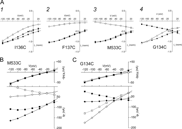 Figure 6. . Current–voltage (I–V) curves for selected mutants. (A) Mutants that showed significantly decreased electrogenic activity at −50 mV after MTSEA exposure: I136C (1), F137C (2) in ECL-1, and M533C (3) in ECL-4, before MTSEA exposure (filled squares) and after 3–5 min exposure to 1 mM MTSEA (empty squares) (n ≥ 4). G134C (4) in ECL-1 showed increased electrogenic activity at −50 mV after MTSEA exposure. Each data point is the change in holding current induced by 1 mM Pi (pH 7.4, in ND100), normalized to the magnitude of IPi at −100 mV, 1 mM Pi, before MTSEA exposure. For G134C, the data were normalized to the magnitude of IPi at −100 mV after MTSEA exposure. WT steady-state I–V data for IPi (filled circles) for WT-expressing oocytes, normalized to the magnitude of IPi at −100 mV (n = 4), are superimposed. SEMs smaller than symbol size are not shown. (B) I–V data showing the respective leak current (top) and Pi-dependent current (1 mM Pi) (bottom) for a representative oocyte that expressed M533C before (filled squares) and after (empty squares) MTSEA exposure; data points joined by dotted lines. The leak was estimated from the response to superfusion in 1 mM PFA (−IPFA). The Pi-dependent currents were leak corrected by adding the respective leak values at each test potential before MTSEA exposure (filled diamonds) and after MTSEA exposure (empty diamonds); data points joined by continuous lines. (C) I–V data showing the respective leak current (top) and Pi-dependent current (1 mM Pi) (bottom) for a representative oocyte that expressed G134C before (filled squares) and after MTSEA exposure (empty squares); data points joined by dotted lines. The Pi-dependent currents were leak corrected by adding the respective leak values at each test potential before MTSEA exposure (filled diamonds) and after MTSEA exposure (empty diamonds); data points joined by continuous lines. |
