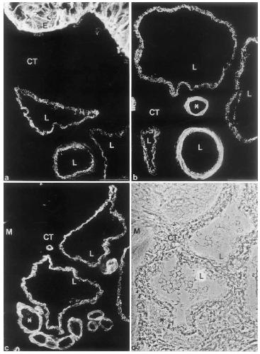 Fig. 1 a-d. Immunofluorescence microscopy performed on cryostat sections of frozen esophagus tissue from Xenopus laevis, using different