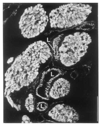 blood vessels (L, lumina) are brightly stained; bar, 50 um |