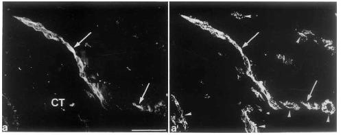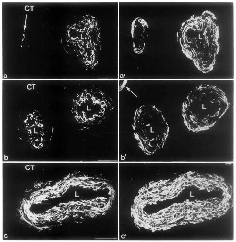 the vascular wall (a, bracket), whereas endothelial cells are negative (b, b’); L, lumen; CT, connective tissue; bars, 50 um |