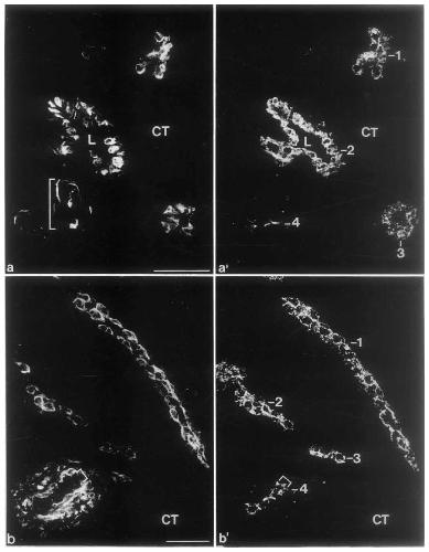 cell tracts positive only for cytokeratin (a) or for desmin (b’): L, lumen: CT, connective tissue; bars, 20 um |