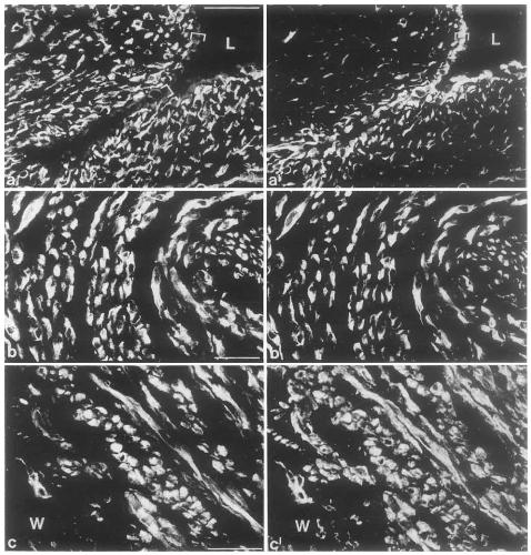 Fig. 12a-c’. Double-label-immunofluorescence microscopy of cross-sections through snap-frozen human umbilical cord artery, using
