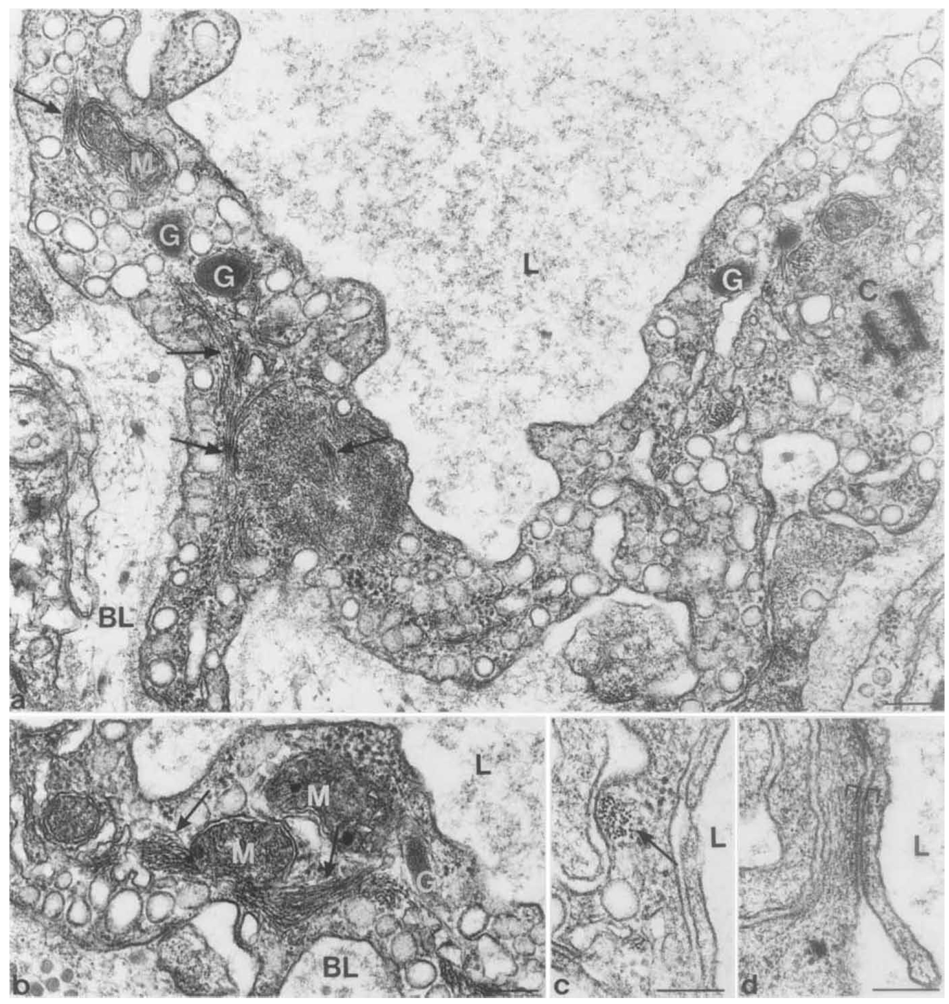actin microfilaments; BL, basal lamina; A4 mitochondria; C, centriole; L, lumen; C , cytokeratin storage granules; burs, 0.25 um |