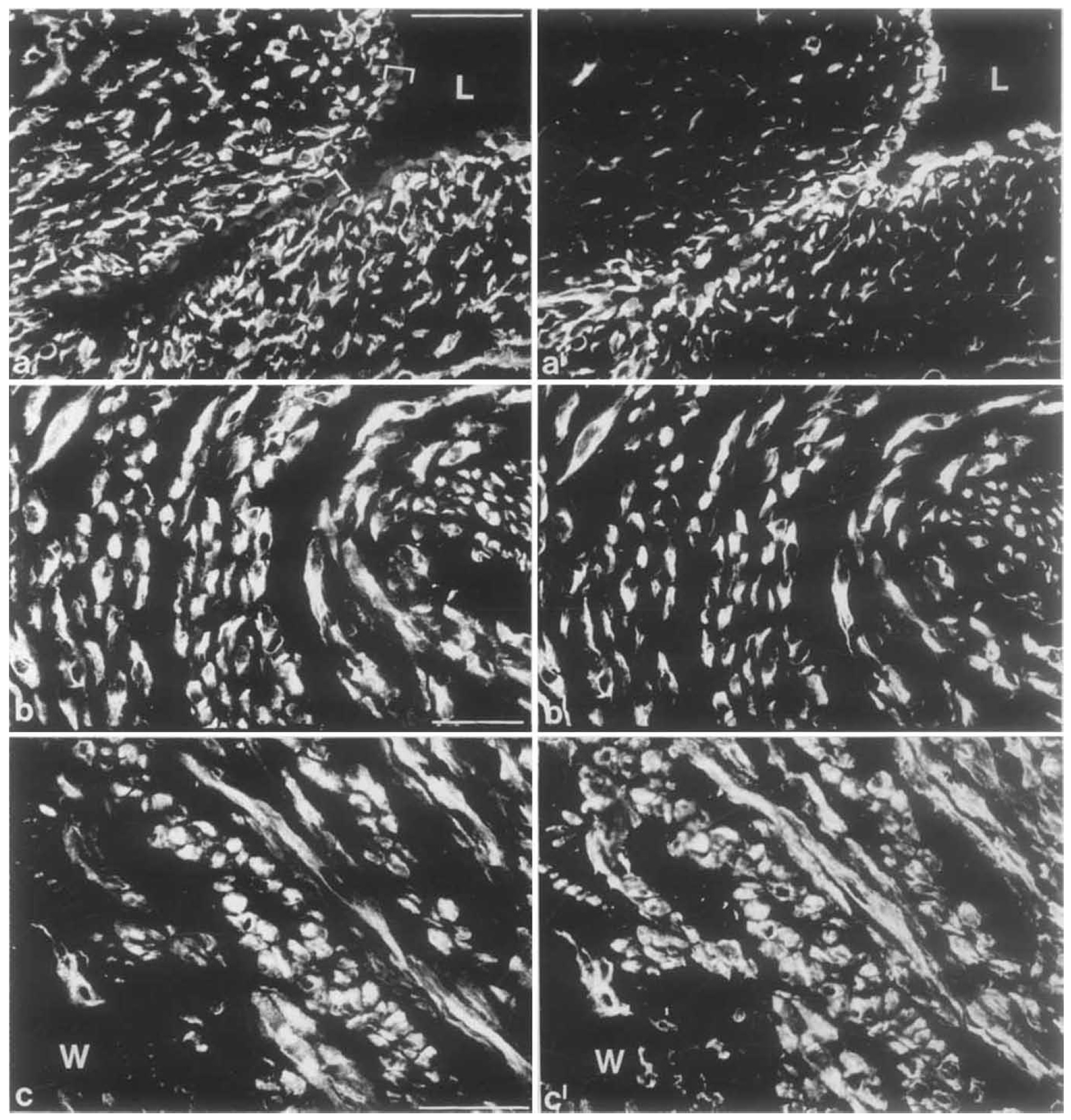 to vimentin (a’, b’) or monoclonal murine antibody to desmin (c’). Note that here endothelial cells (brackets in a and a’; L, lumen)