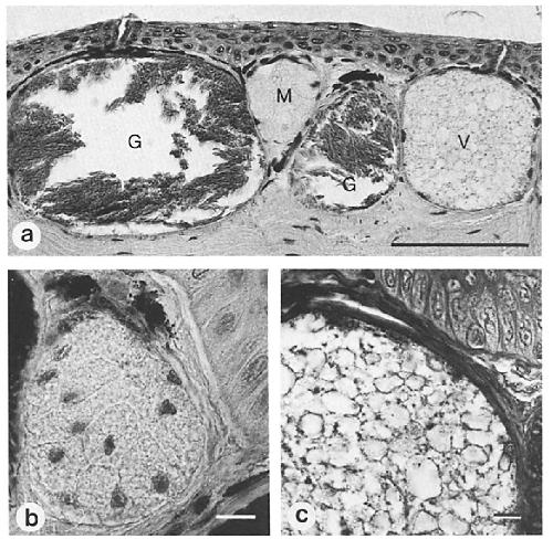 within the same granular gland (G) in serial sections, whereas the vacuolated stage (V) and the mucous gland (M) showed no immunoreactivity.