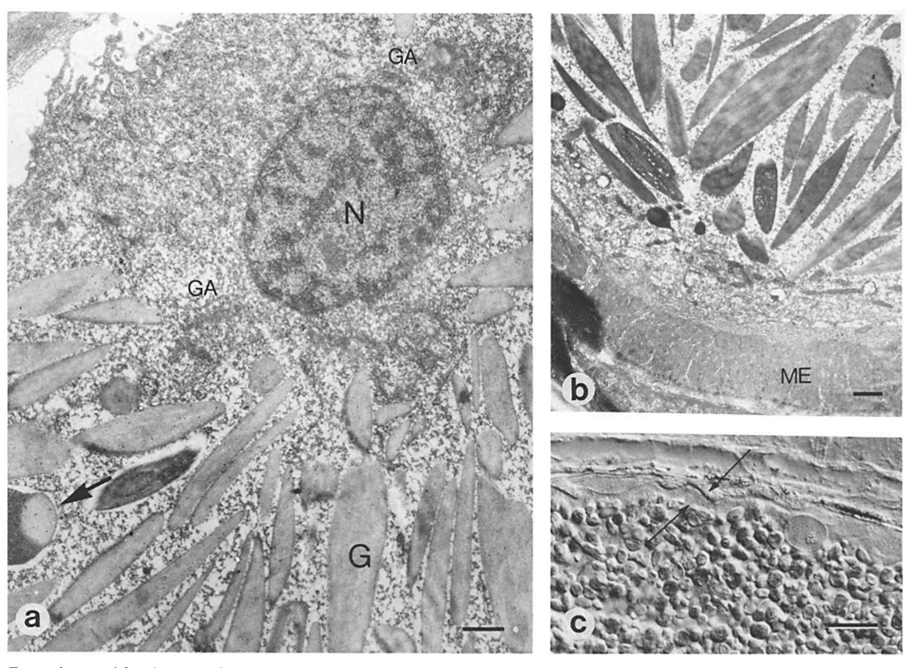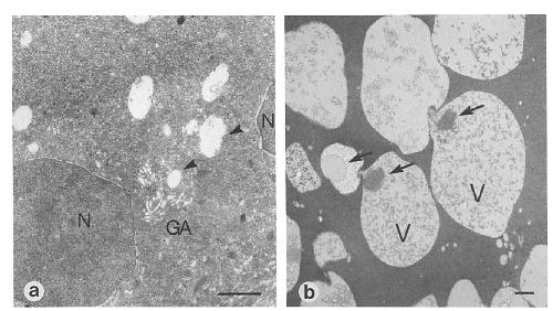 (GA) vesicular structures can be observed (arrowheads). (b) The interior of the gland is filled with vacuolated material. The vacuoles
