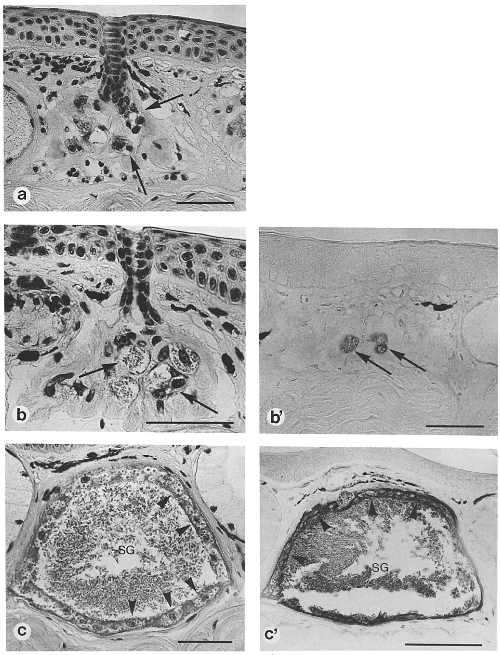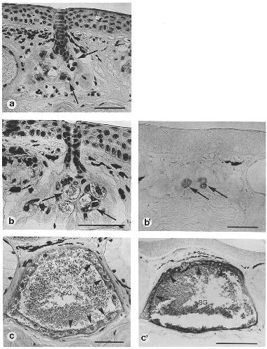 immunoreactivity. (a) Bar, 50 p.m. (b) Bar, 50 lam. (c) Bar, 50 I.tm. (b') Bar, 50 p.m. (c') Bar, 100 p.m. |