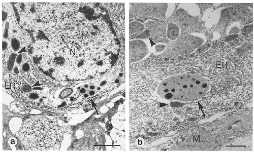 contains large multicored bodies (arrows) as well as mature storage granules (arrowheads). Nucleus (N); myoepithelial cells (M). (a) Bar,
