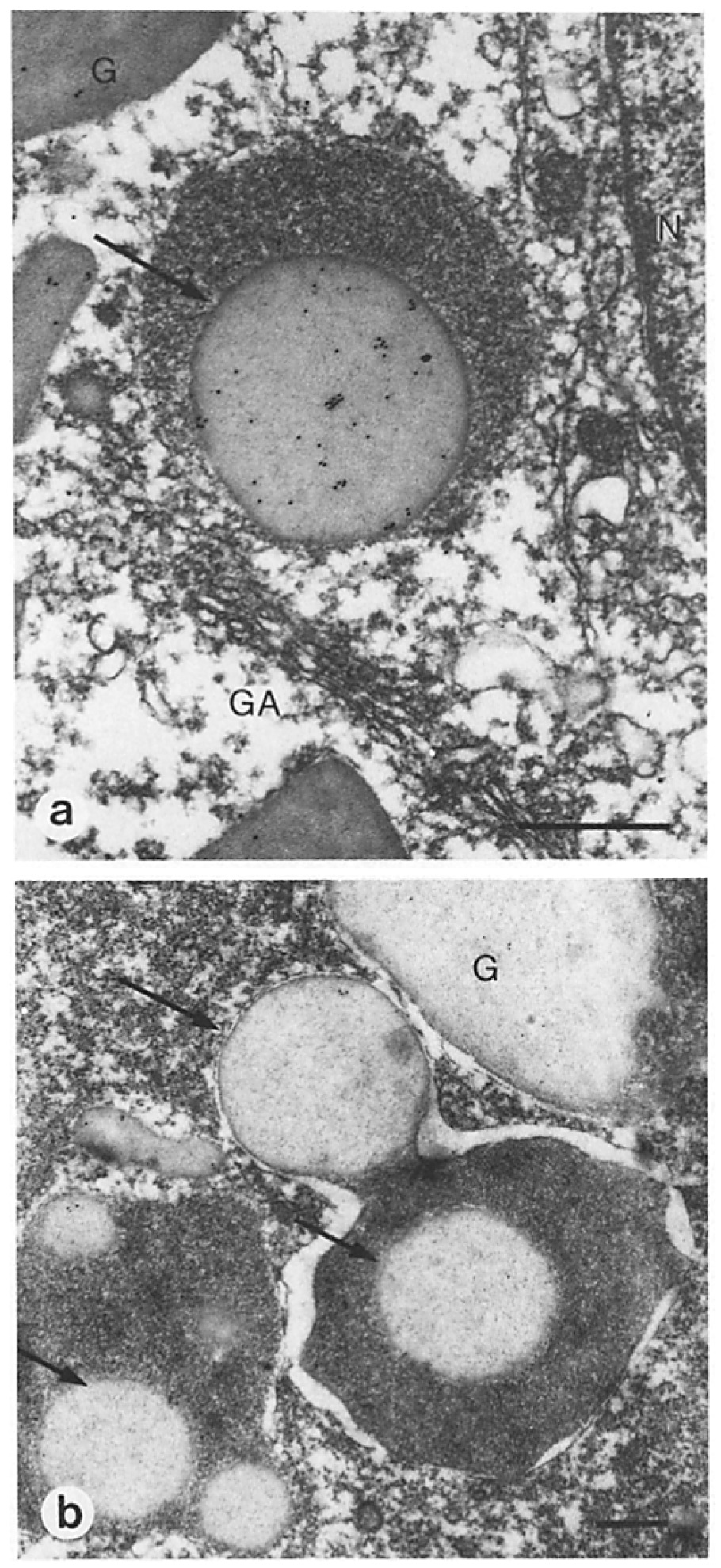 (N), storage granule (G). (a) Bar, 0.5 Ixm. (b) Bar, 0.5 ~tm. |