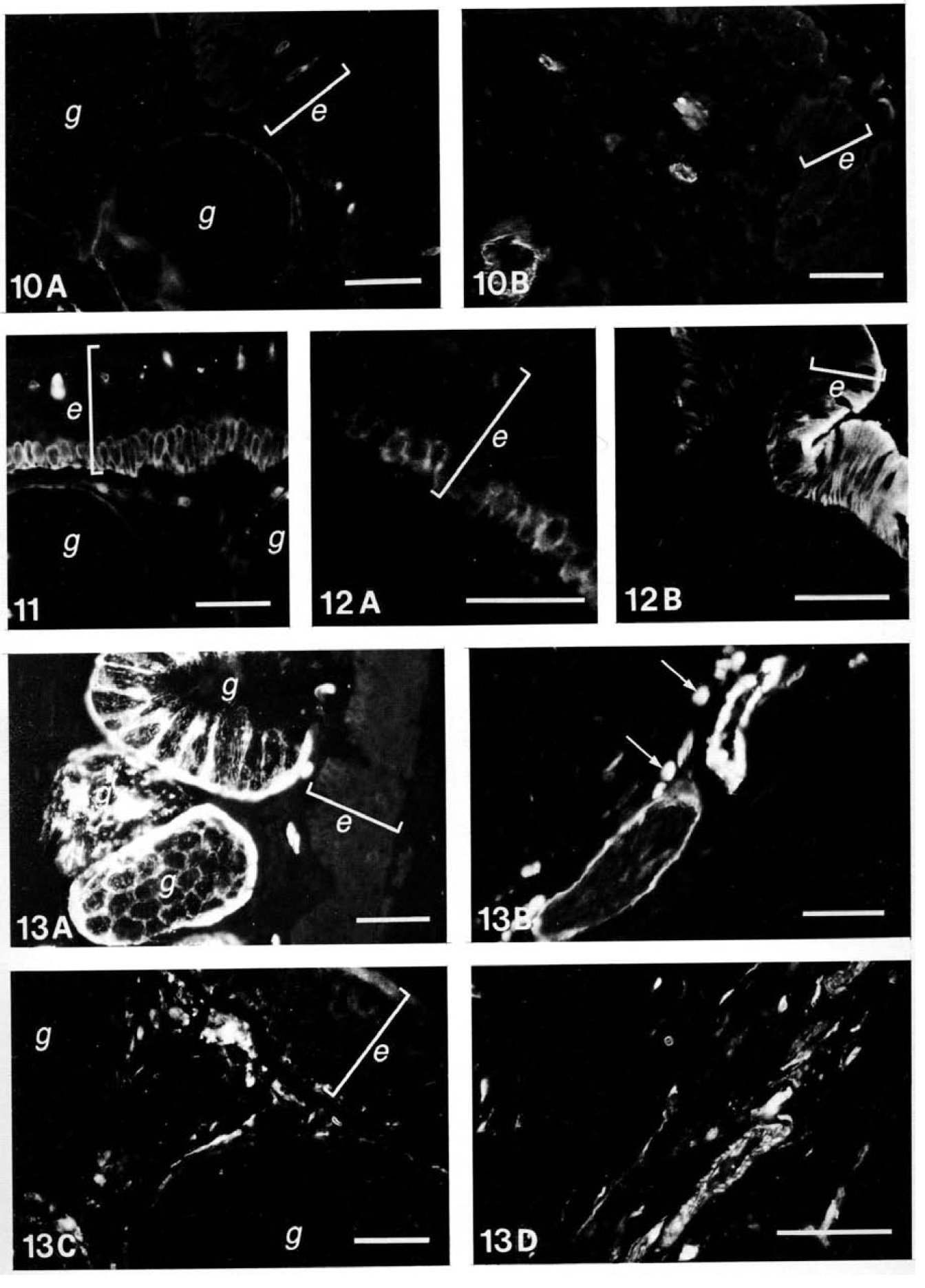 Abbreviations: e, epidermis; g, gland. Bars, 50 fim. |