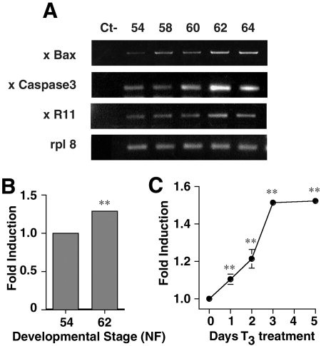 Figure 2. xlbax expression during natural and induced metamorphosis. A: Total RNA was extracted from isolated tail at different metamorphic stages and assayed by polymerase chain reaction (PCR) for the expression of xlbax, xcaspase3, and xR11 mRNAs. The internal control was Rpl8. After 30 cycles of PCR, 10 μl of the reaction were electrophoresed on 2% agarose gels and stained with ethidium bromide. In the Ct- lane, the reverse transcription product was replaced by water to check for PCR contamination. B: A more quantitative PCR procedure using 32P-labeled dCTP was carried out to compare stage NF54 and NF62. After 20 cycles of PCR, 10 μl of the reaction were electrophoresed on acrylamide gels and the results were quantified by PhosphorImager scanning. The average values SEM of three experiments are expressed as fold induction where 1 equals means for stage NF54. Moreover for each sample, densitometry readings were normalized against the value for rpl8 RNA. Statistical signification as compared with the untreated animals is expressed as **P < 0.01. C: Stage NF55 tadpoles were treated for 1 to 5 days with T3 (10 nM). Total RNA was extracted from isolated tails and assayed by PCR for the expression of xlbax mRNAs as described in B. The figure presents one of two independent experiments.