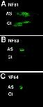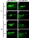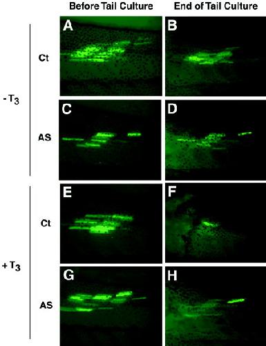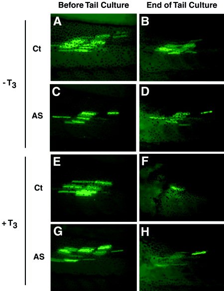 Figure 7. xlbax antisense (AS) transfection delays cotransfected green fluorescent protein (GFP) disappearance during T3-induced metamorphosis in tail culture. Stage NF55 tadpoles were cotransfected in the tailmuscle with 1 μg of peGFP-C1, 0.1 μg of pcDNA3-fLuciferase, and either 1 μg of a control pcDNA3 vector or pcDNA3-xlbax AS72. GFP expression was observed directly 3 days after transfection. Both tadpole groups were killed, and the tails were maintained in culture in absence or presence of T3 (10 nM) for 8 days. A,E: GFP expression in the control (Ct) group before tail culture. C,G: GFP expression in antisense (AS) group before tail culture. B: GFP expression in the Ct group after tail culture without T3 treatment. D: GFP expression in the AS group after tail culture without T3 treatment. F: GFP expression in the Ct group after tail culture with T3 treatment. H: GFP expression in the AS group after tail culture with T3 treatment. Each figure represents one of at two independent experiments with identical results.