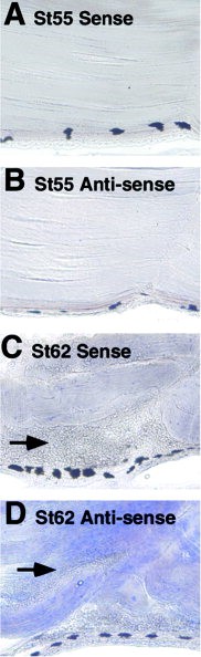 Figure 3. xlbax mRNA spatiotemporal expression during natural metamorphosis. B,D: Endogenous bax mRNA expression was followed in tailmuscle at stage (St) NF55 (B) and NF62 (D) by in situ hybridization, using an antisense digoxigenin-labeled probe on longitudinal Vibratome sections. A,C: Some sections were hybridized with a sense probe to test for specificity (A, NF55 and C, NF62). Black arrows indicate dead muscle fibers. The in situ hybridization was done twice on independent groups of tadpoles and gave identical results.