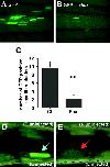 Figure 4. xlbax transfection reduces expression of cotransfected green fluorescent protein (GFP) in muscle cells in vivo. Tadpoles were cotransfected in the tailmuscle with 1 μg peGFP-C1 and either 2 μg of a control plasmid vector (pcDNA3) or a plasmid-expressing xlbax (pcDNA3-xlbax). Three days later, animals were photographed directly in toto under a dissecting scope equipped with fluorescent light. A: In vivo detection of GFP expression in control-injected tadpole. B: GFP detection in tadpolemuscle injected with xlbax. Note decreased GFP expression compared with A. C: Numbers of GFP-positive myofiber clusters in control (Ct, A) and xlbax (B) -injected tadpoles. Means SEM are given; n ⥠10 in all cases; **P ⤠0.01. D,E: Longitudinal Vibratome sections of tail observed under a microscope equipped with fluorescent light. D: Section of control-injected tadpoletailmuscle. The blue arrow indicates GFP-positive myofibers. E: Section of tadpoletailmuscle injected with xlbax. No GFP-positive myofibers were observed. The red arrow indicates sites of myofibers loss. Each section shown on the figure is from one of two independent experiments providing identical results.