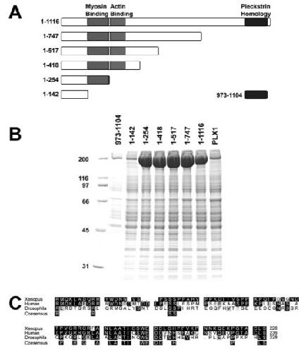 Figure 3. Delineation of myosin II binding region in anillin. (A) Schematic of anillin truncation fragments with minimal myosin binding region, region homologous to actin binding region, and pleckstrin homology domain highlighted. (B) Eluates from affinity columns for each of the fragments of anillin and Polo kinase (PLX1). Myosin II is the prominent band at 200 kDa. (C) Homology align-ment of Xenopus, human, and Drosophila anillin in the myosin binding region. |
