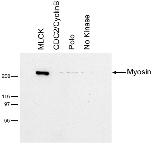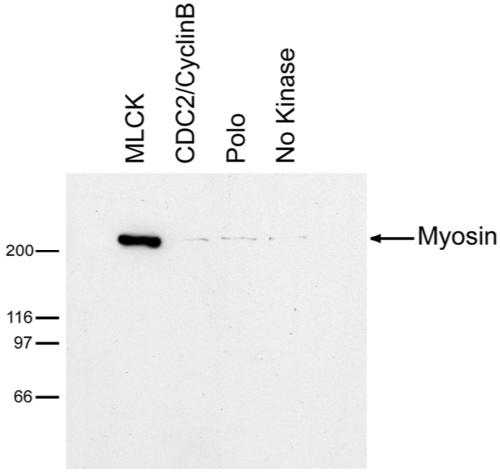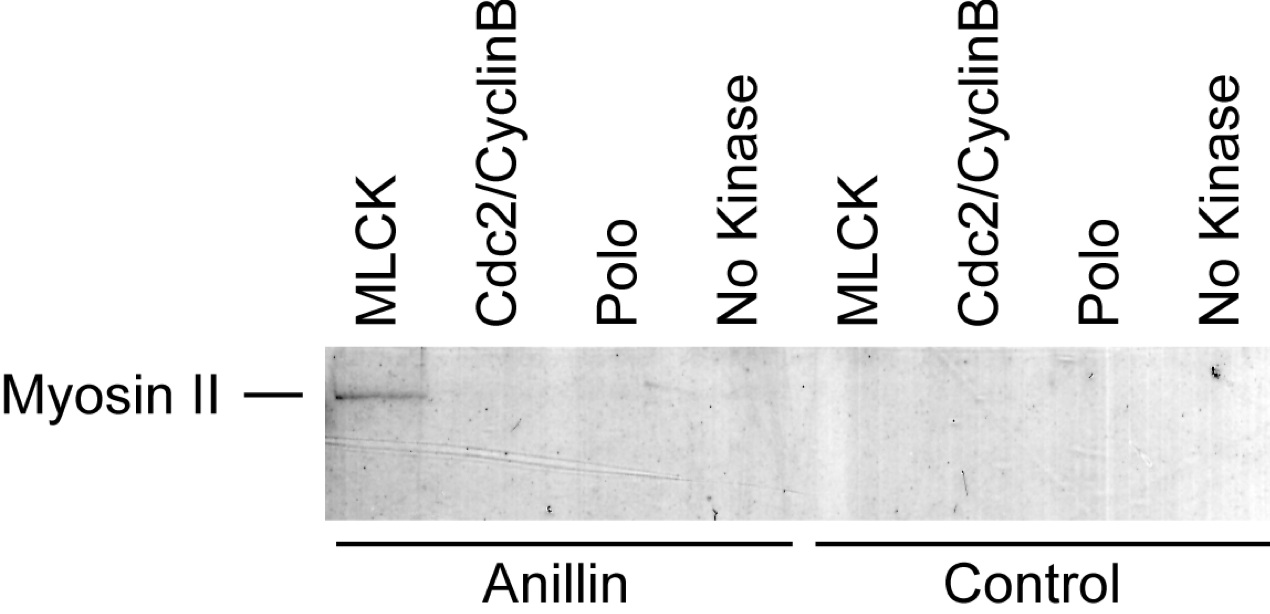 Figure 4. Anillin binds activated myosin II. Myosin II precipitation by anillin after myosin II phosphorylation by MLCK, Cdc2/CyclinB, Polo kinase, or no kinase. |